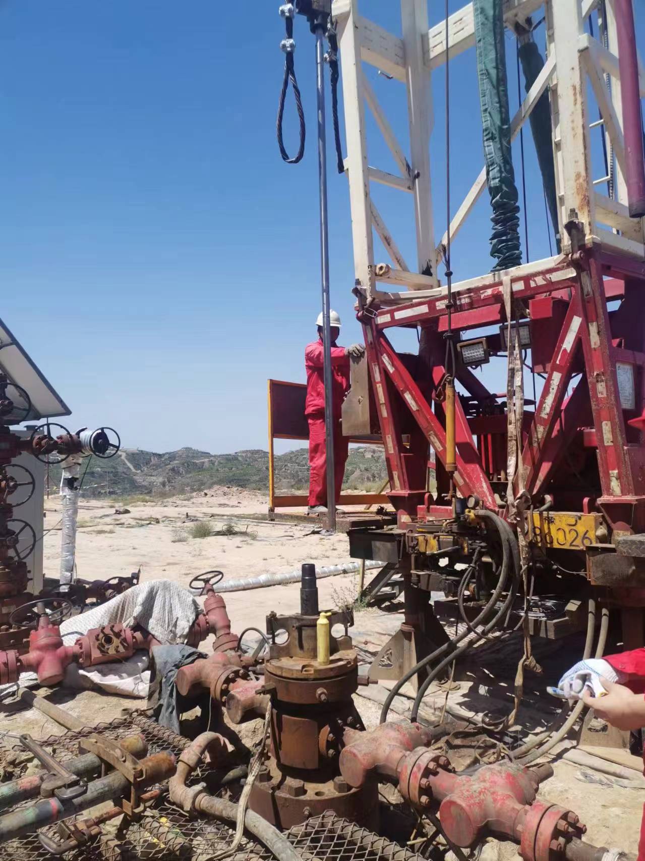 團(tuán)隊(duì)兩位同事晚上在車上隨便休息了兩三個(gè)小時(shí),第二天早上不到8點(diǎn)就馬不停蹄與甲方技術(shù)人員一同去往井場(chǎng)。去往井場(chǎng)的路坡大彎急,有那么3公里的土路特別不好走,不過(guò)這個(gè)團(tuán)隊(duì)經(jīng)常外出測(cè)井,開(kāi)車技術(shù)過(guò)硬,50分鐘后到達(dá)井場(chǎng)。
